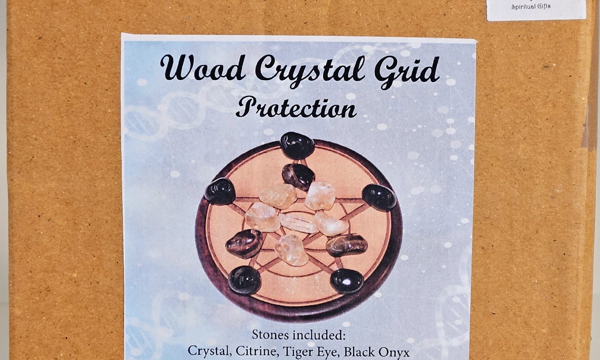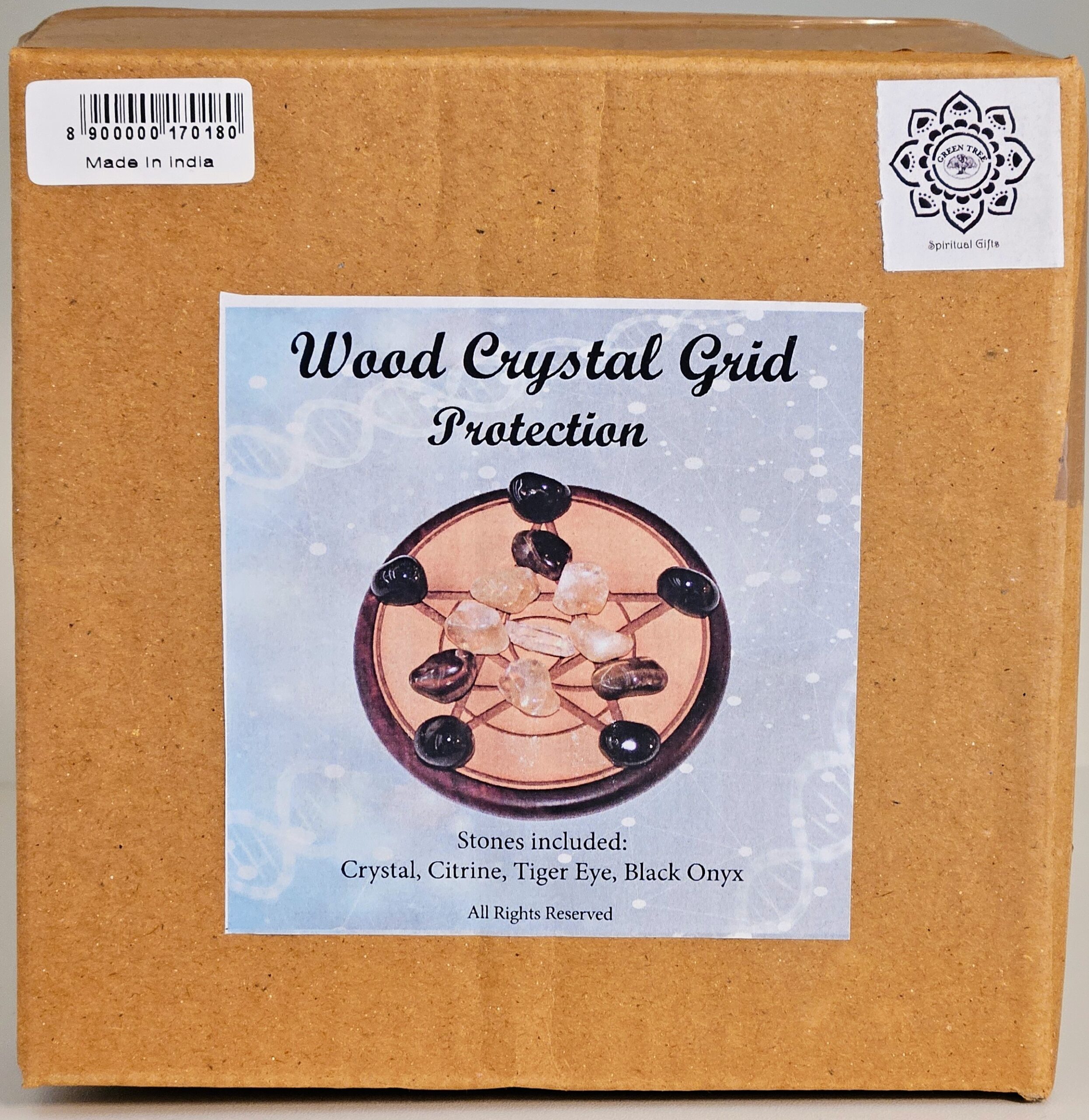 Lesena mreža s priloženimi kristali za zaščito kamena strela, citrin, tigrovo oko, črni onyx. Premer 15 cm.